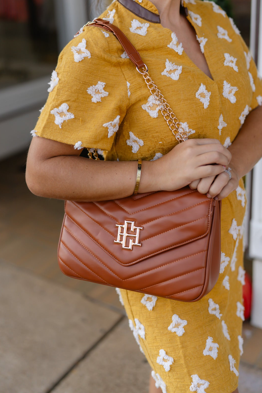 The Mia Crossbody Bag in Saddle VQ features a chic v-quilted design accented by a bold CH logo, perfect for elevating any outfit. Its versatile chain strap can be styled in two ways for day-to-night wear. Inside, a zippered divider and a dedicated cell phone pocket keep your essentials organized and accessible without sacrificing style.