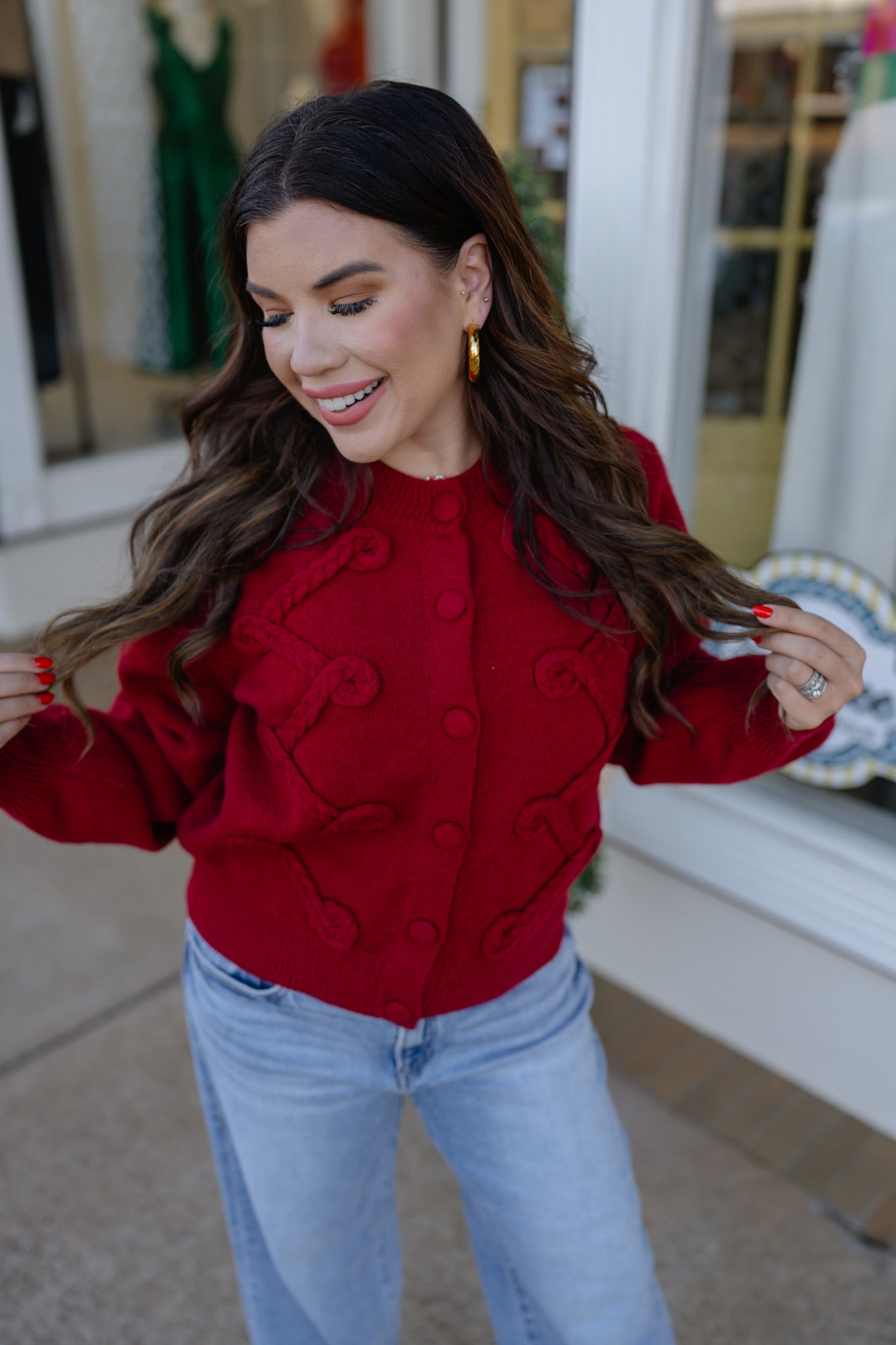Introducing the Avery sweater. This red sweater boasts a classic button-up design, providing a timeless and sophisticated look. Its versatility allows it to easily transition from casual to formal settings, making it a staple in any wardrobe. Stay warm and stylish with the Avery sweater.