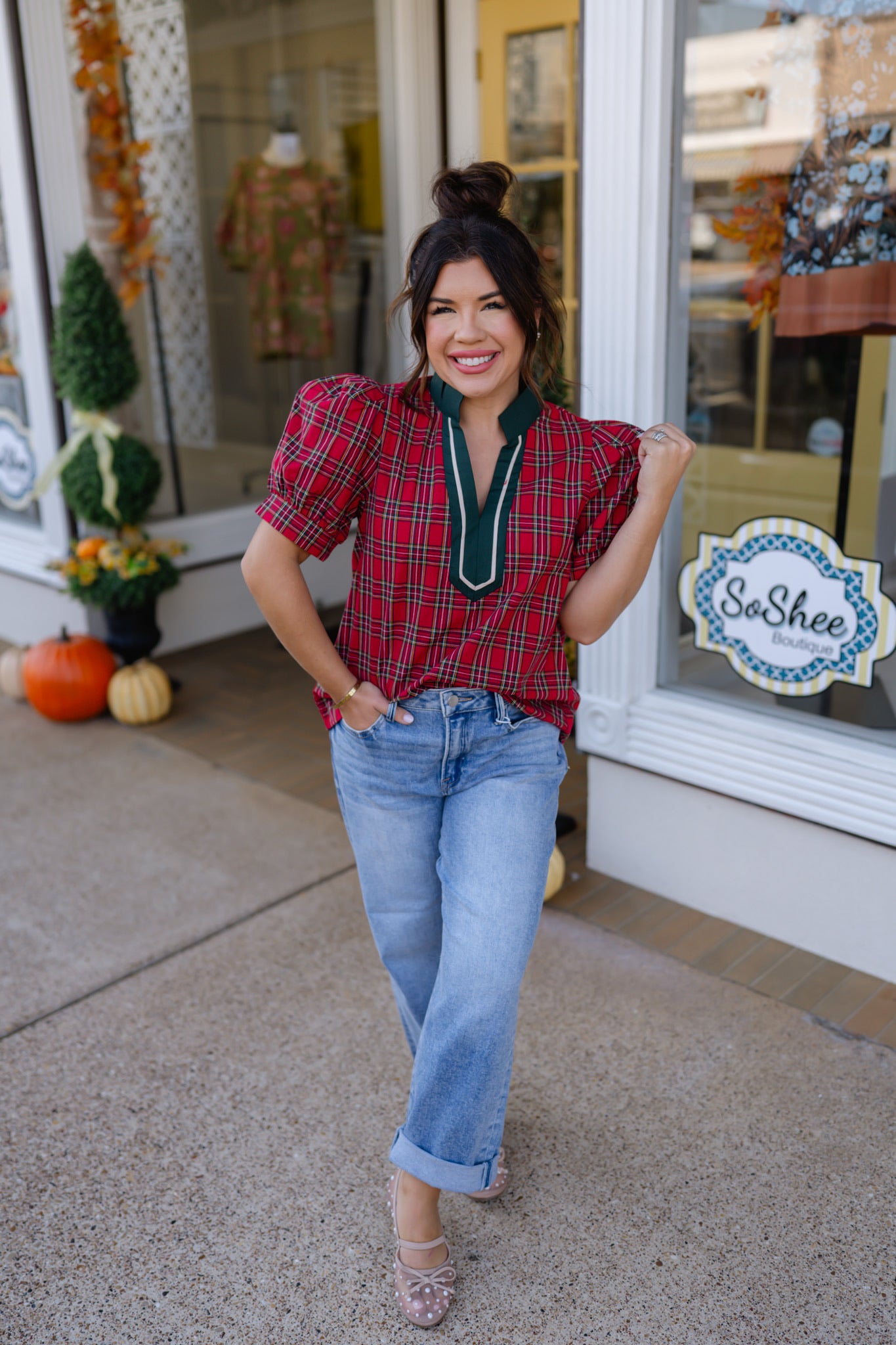 Get ready to rock in The Carrie Top! This red plaid top features playful puff sleeves and a flattering v neckline, perfect for adding some fun to your wardrobe. A must-have for those who don't take themselves too seriously.