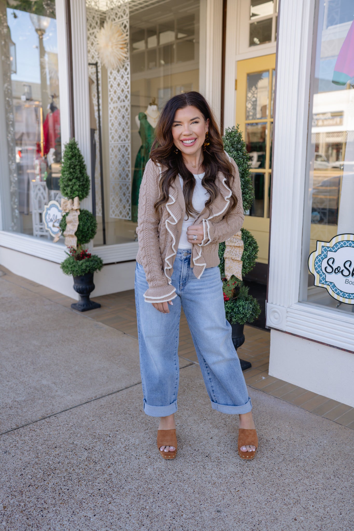 "The Julie Sweater is the perfect blend of classic and whimsical with its charming button up design adorned with delicate brown and white ruffles. Keep warm and stylish in this unique and playful piece!"