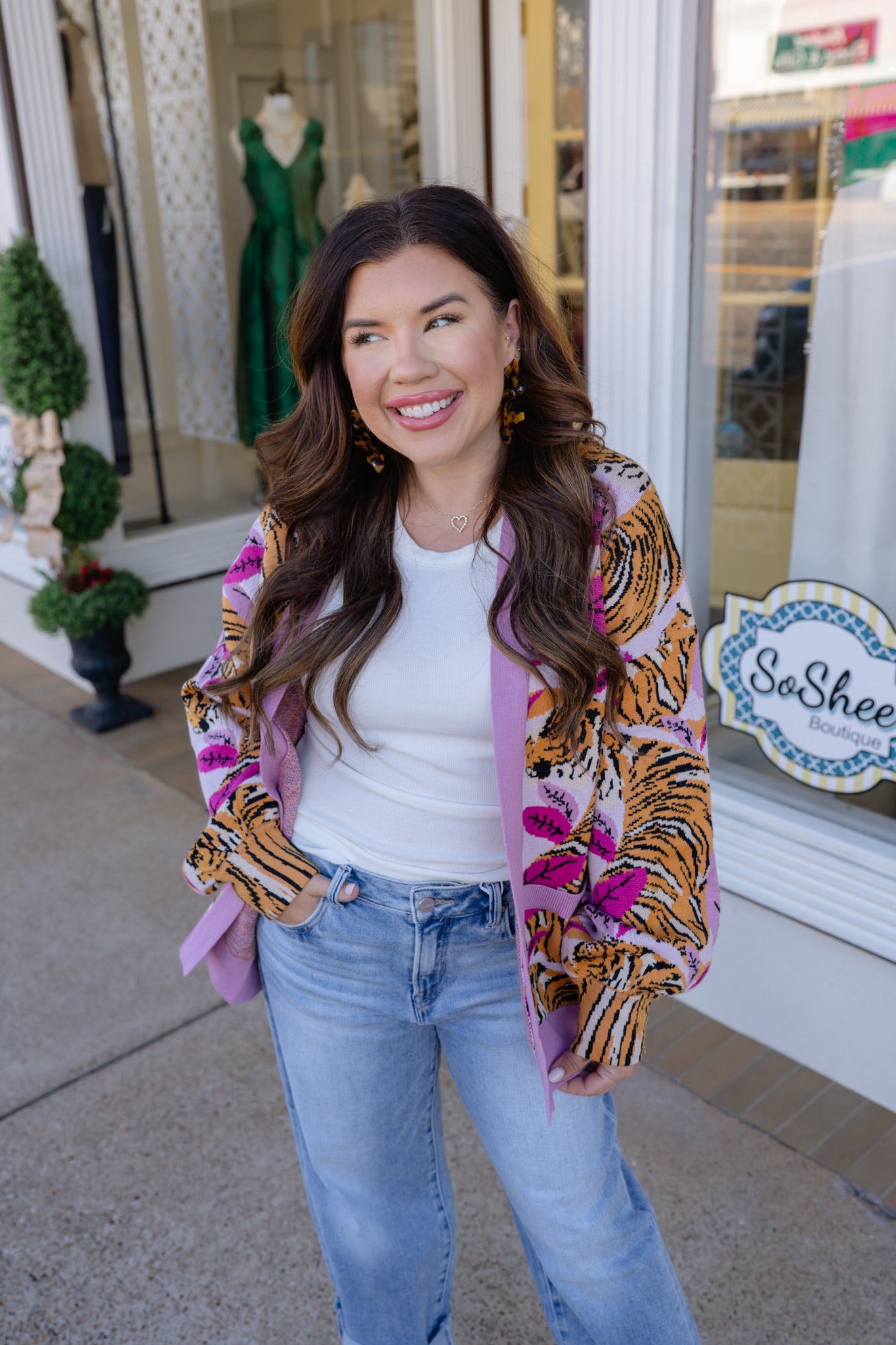 Add a playful pop to your wardrobe with The McKenzie Cardigan. Its subtle, yet bold tiger print will make a statement wherever you go. Made with soft, thick material, this cardigan also features a functional pocket for added convenience.